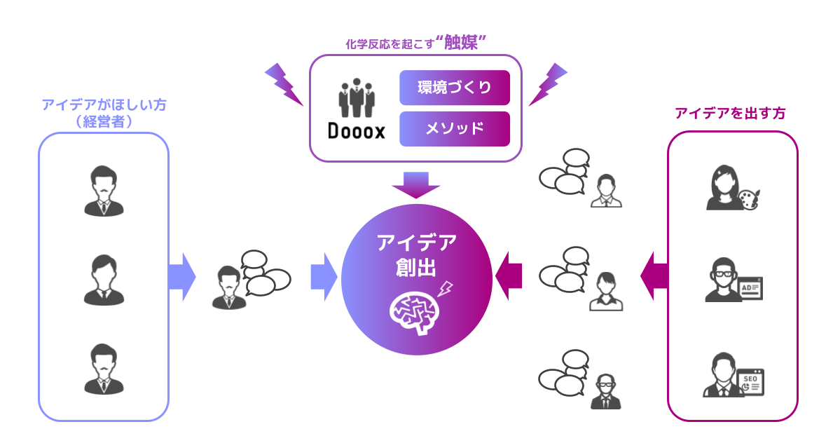 アイデアを必要とする経営者の皆さまと、アイデアで誰かの力になりたいという熱量をお持ちの方を繋ぎ、化学反応を巻き起こす次世代型プラットフォームを提供。異なる分野や業界の人材を組み合わせることで、新たな視点を獲得し、従来の枠組みに囚われない独創的で革新的なアイデアの創出を支援します。
